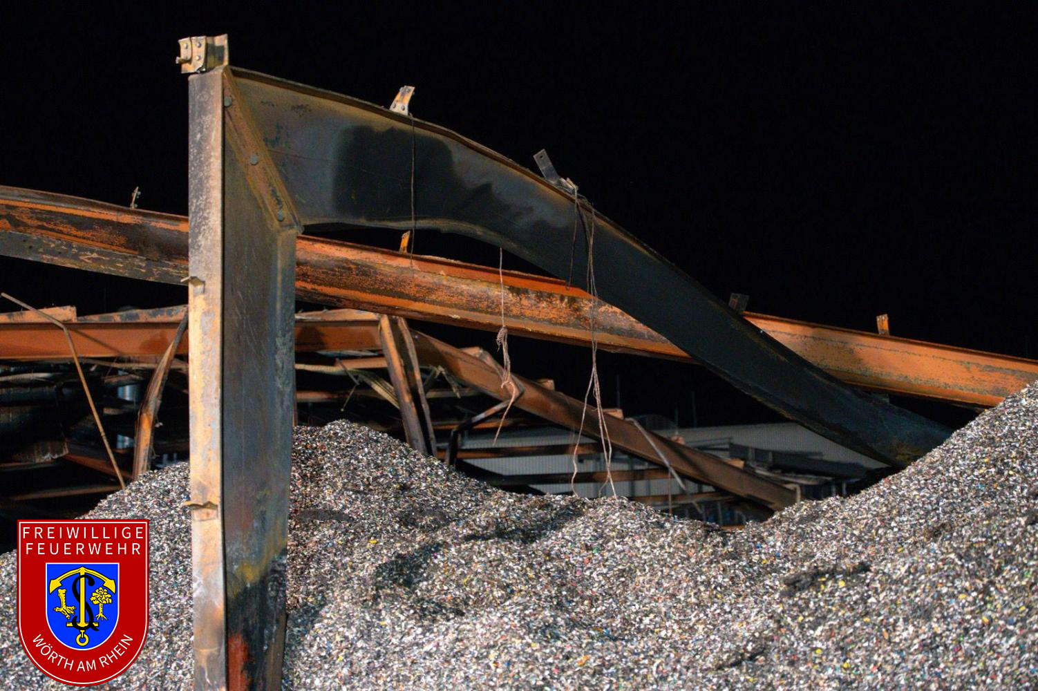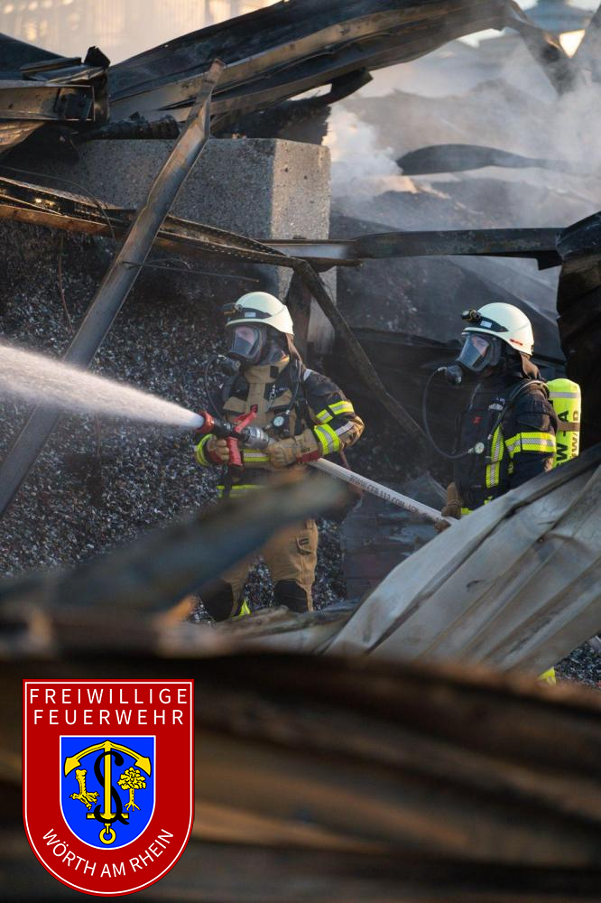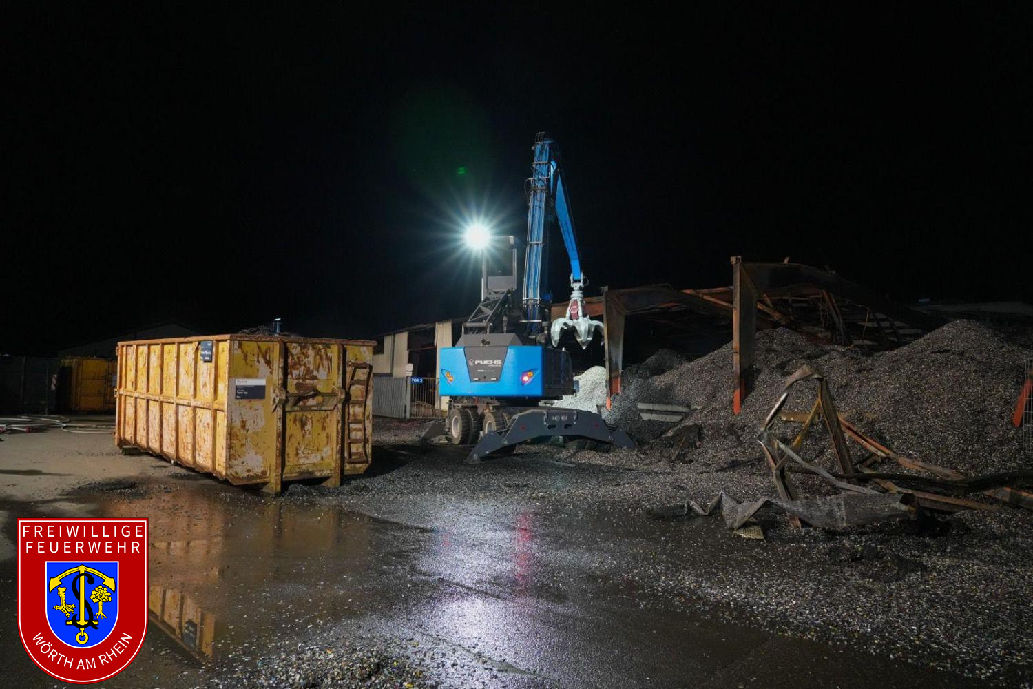 Die Nachlöscharbeiten gestalteten sich zeitaufwendig. Das Dach der betroffenen Halle wurde kontrolliert geöffnet, um Glutnester gezielt ablöschen zu können. Parallel dazu wurde das Brandgut mit mehreren Baggern auseinandergezogen, abgelöscht und in Container verladen. Die Nachlöscharbeiten zogen sich bis in die Nachtstunden