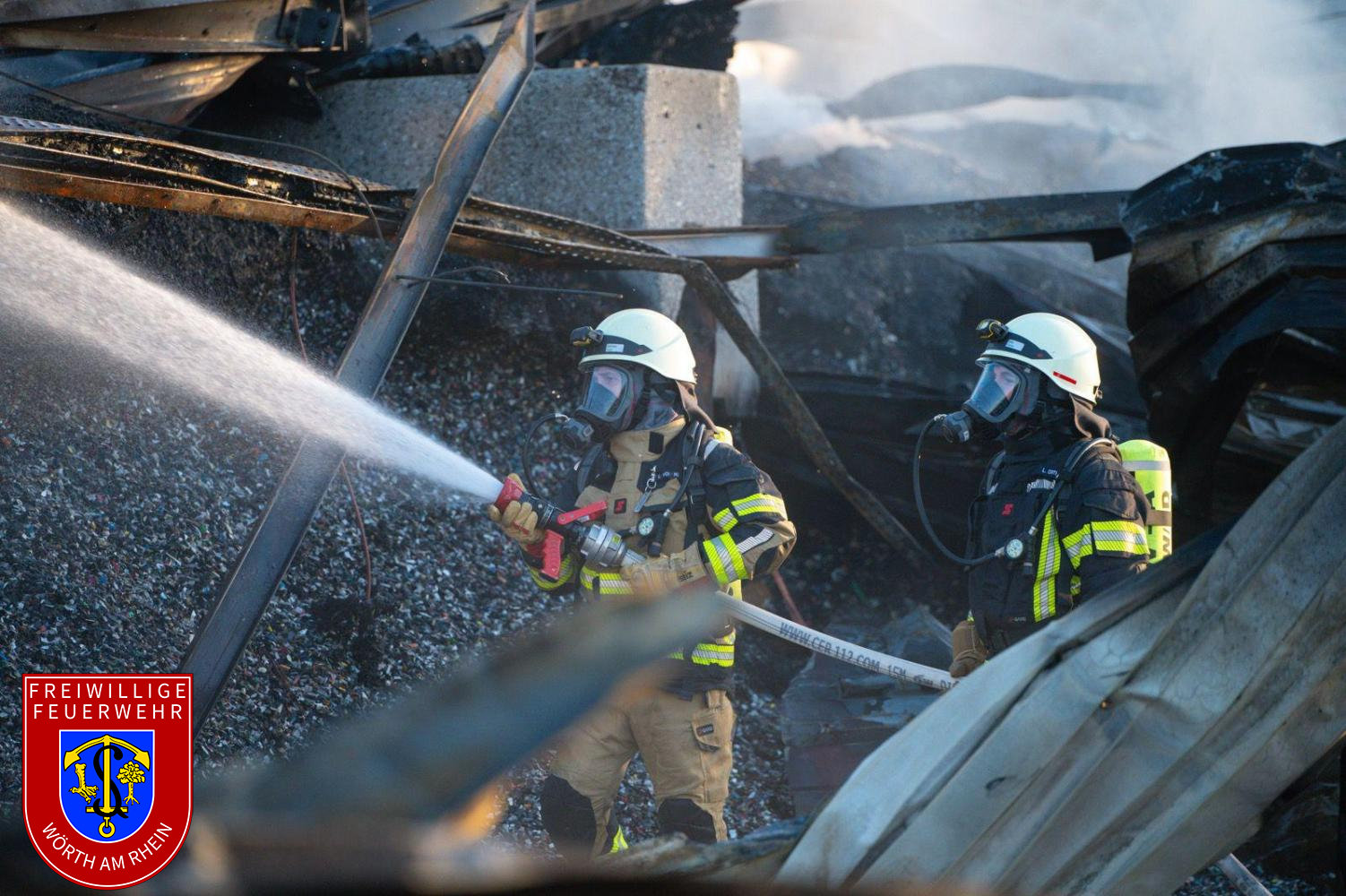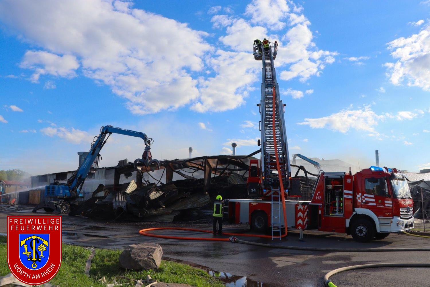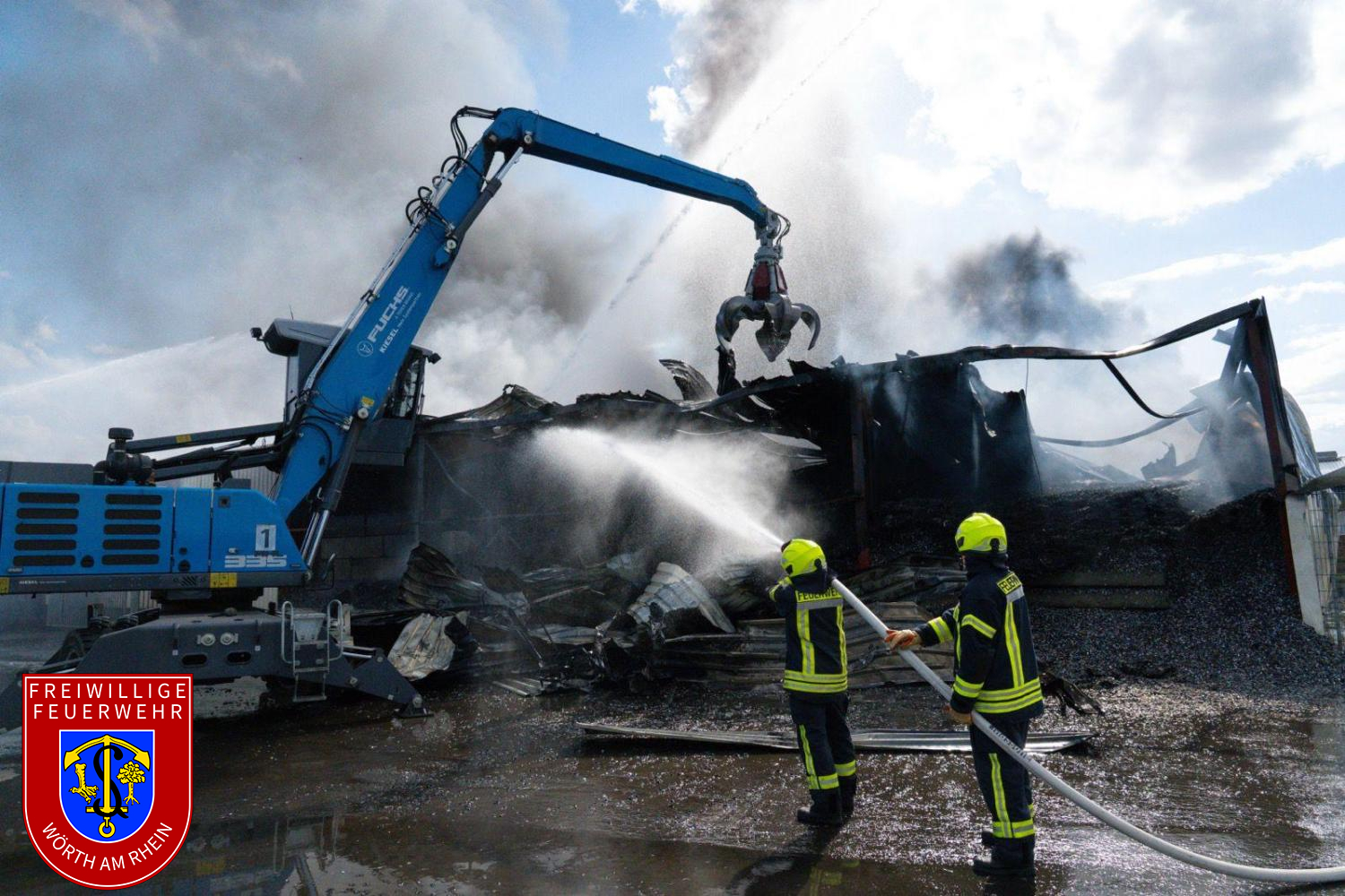 Die Nachlöscharbeiten gestalteten sich zeitaufwendig. Das Dach der betroffenen Halle wurde kontrolliert geöffnet, um Glutnester gezielt ablöschen zu können. Parallel dazu wurde das Brandgut mit mehreren Baggern auseinandergezogen, abgelöscht und in Container verladen. Die Nachlöscharbeiten zogen sich bis in die Nachtstunden