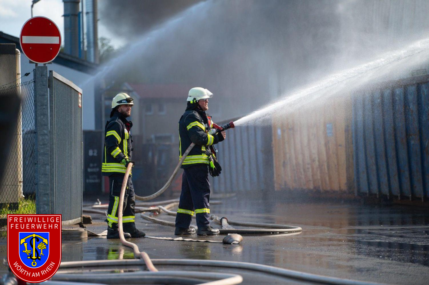 Oberste Priorität hatte der Aufbau einer sogenannten Riegelstellung, um ein Übergreifen der Flammen auf angrenzende Gebäude und Lagerbereiche zu verhindern. Dies gelang durch den Einsatz von zwei Hubrettungsfahrzeugen und handgeführten Strahlrohren. Mehrere Trupps unter Atemschutz waren im Einsatz.